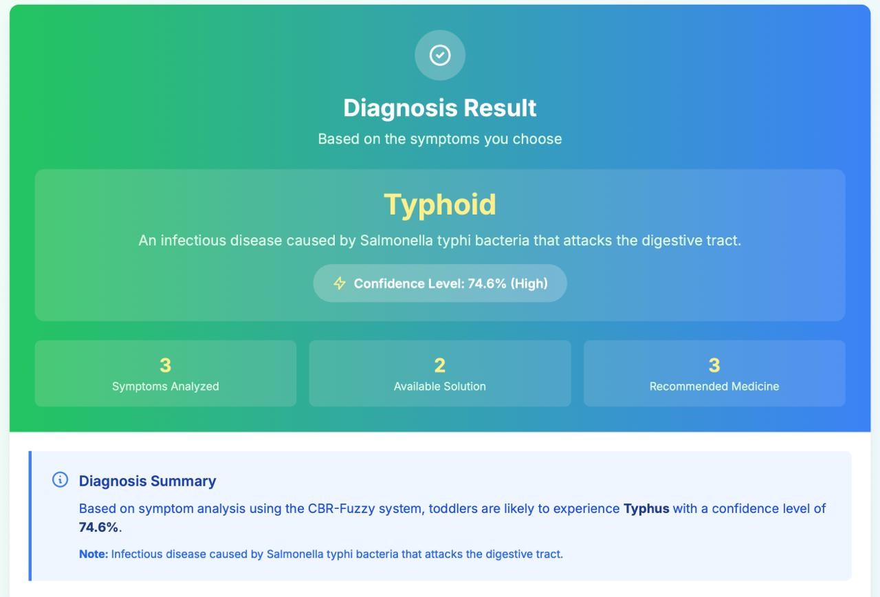 This study aims to develop a treatment recommendation system for toddlers based on Case-Based Reasoning (CBR) combined with Fuzzy Logic, by integrating modern medical knowledge and local wisdom. The system was developed to address the need for adaptive initial diagnosis recommendations, particularly in addressing ambiguous symptoms. At the case representation stage, disease, symptom, and drug data from medical and traditional perspectives are used as the knowledge base. The CBR process serves as the primary mechanism for searching for similar cases, while fuzzy logic is used at the revision stage to provide degrees of symptom intensity so that the diagnosis results are more flexible. System evaluation was conducted through blackbox testing, accuracy measurements, and the System Usability Scale (SUS) method involving 50 respondents. The results showed that all system functions ran as planned, the accuracy level reached 88%, and the average SUS score was 78.4 in the Good Usability category, indicating the system is easy to use and user-acceptable. This study proves that the CBR–Fuzzy integration is effective in providing accurate, adaptive, and culturally relevant initial diagnosis recommendations. For further research, it is recommended to expand the case base, refine fuzzy rules, develop a broader interface, and implement the system on a mobile platform to improve accuracy, ease of access, and wider user acceptance.